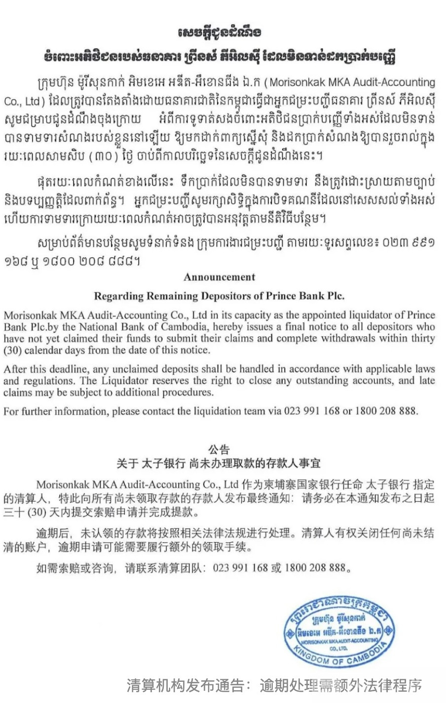 Bole新闻专讯:随着太子银行清算程序逐渐进入尾声,一则“最后通告”近日引发关注。4月8日,负责太子银行清算事务的审计机构Morisonkak MKA公司对外发布通知,提醒仍未申领资金的存款人尽快办理提款手续。根据公告要求,所有存款人须在通知发布之日起30天内提交申请并完成资金提取,否则相关款项可能会按照现行法律规定进行后续处理。