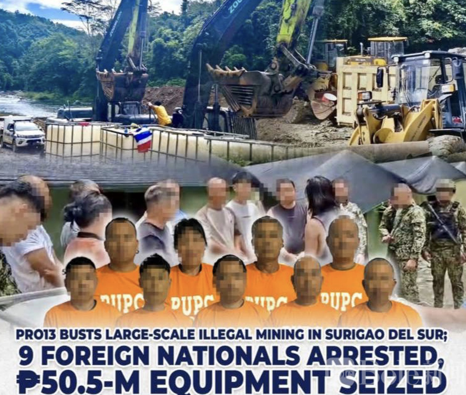 这次执法行动可不是单一警队在作战,而是由第13地区警察局牵头,联合了环境与自然资源部、国家调查局、空军等多个执法单位,多方联动、周密部署,就是为了彻底端掉这个潜藏在当地的非法采矿窝点。行动的具体地点,就在南苏里高省坎蒂兰市洛博村的卡拉坎下游区域,这个地方比较隐蔽,或许也是这伙人敢长期非法采矿的原因之一。