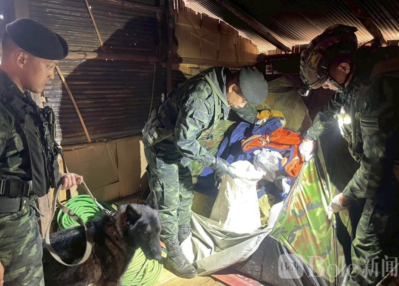 随后,军方人员对现场进行彻底搜查,在帐篷及伪装物中发现20个改装背包,内部藏匿大量毒品。经清点,共查获冰毒约3,993,400粒,以及鸦片3块,重量约4.8公斤。