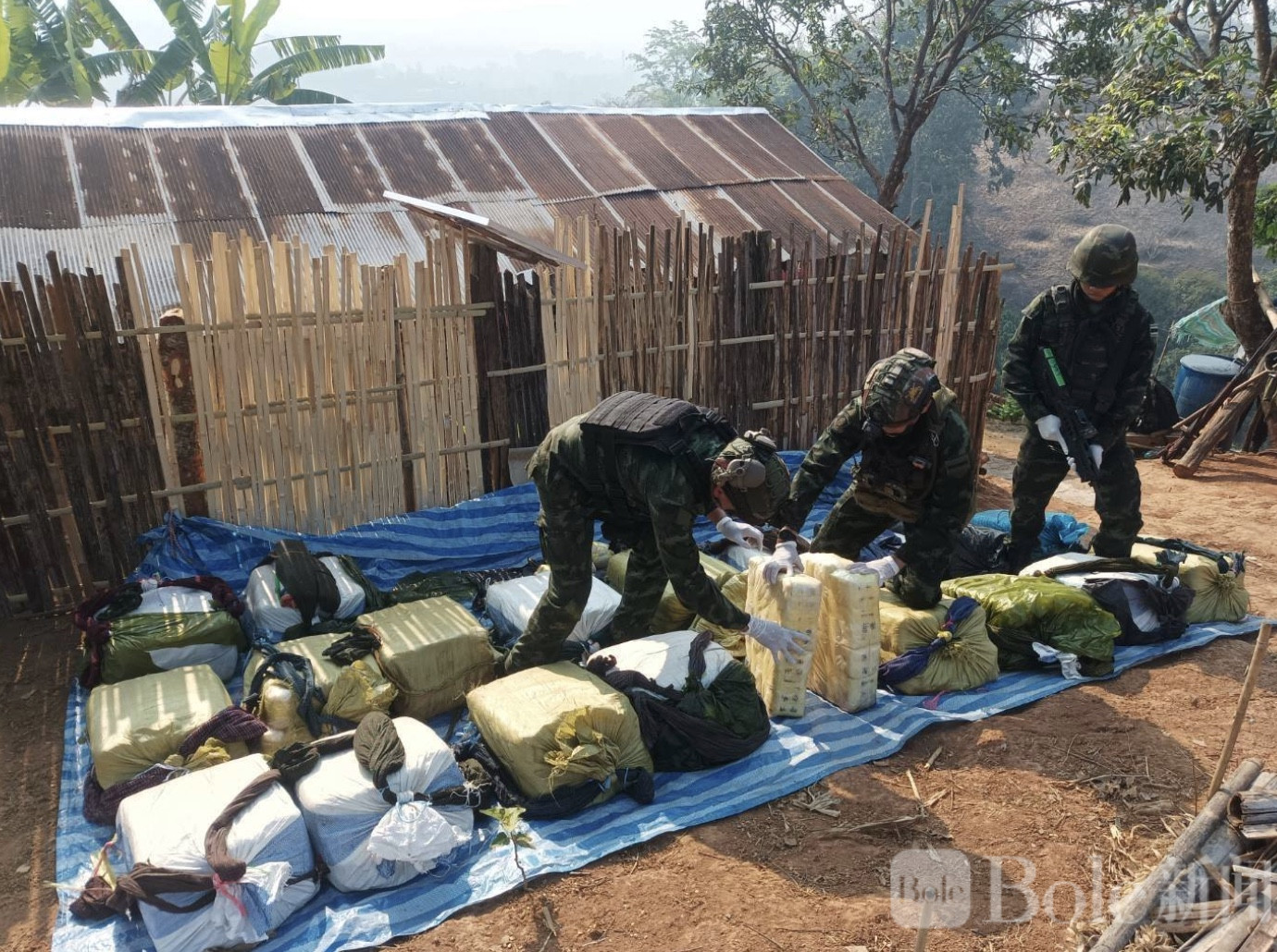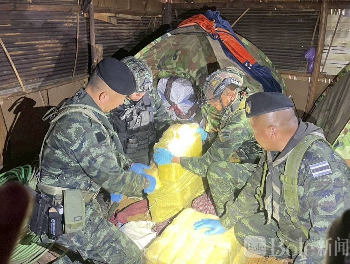 Bole新闻专讯:4月12日据泰国媒体报道,泰北“帕芒部队”在清迈边境地区开展巡逻扫荡行动时,于偏远村庄后方一处木屋成功查获大量毒品,缴获近400万粒冰毒及多块鸦片原料,总重约4.8公斤。
