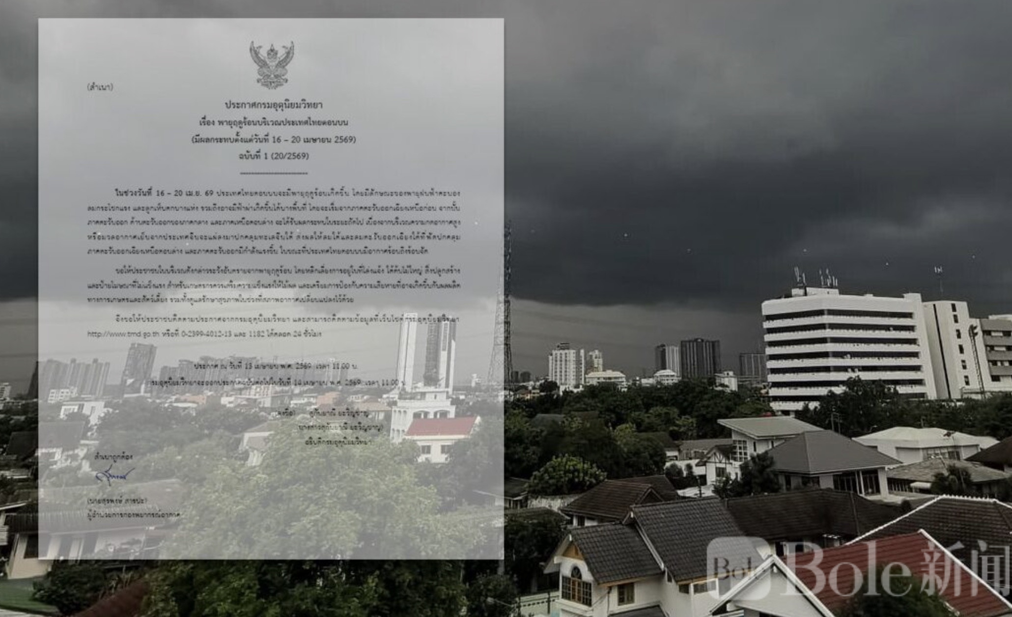 Bole新闻专讯:泰国气象局于13日发布第1号预警通告,提醒全国民众注意即将在4月16日至20日期间出现的强对流天气。根据预报,泰国北部及多地将遭遇雷阵雨、强风、局部冰雹及雷击等极端天气情况。
