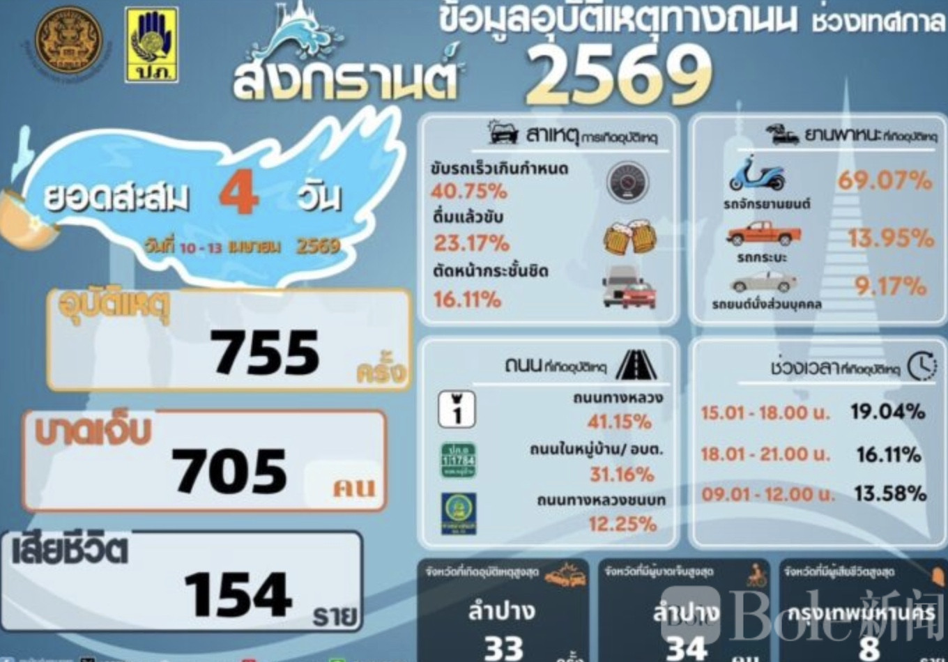从整体数据来看,宋干节前4天(4月10日至13日)累计发生事故755起,造成705人受伤、154人死亡。其中,南邦府事故总数最多(33起),曼谷累计死亡人数最高(8人),全国共有22个府实现“零死亡”。