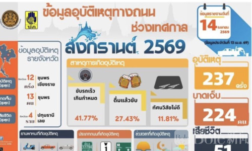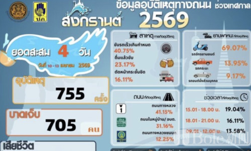 Bole新闻专讯:2026年4月14日,泰国道路安全中心公布宋干节“危险7天”交通数据,第4天(4月13日)全国共发生交通事故237起,造成224人受伤、51人死亡,事故形势依然严峻。
