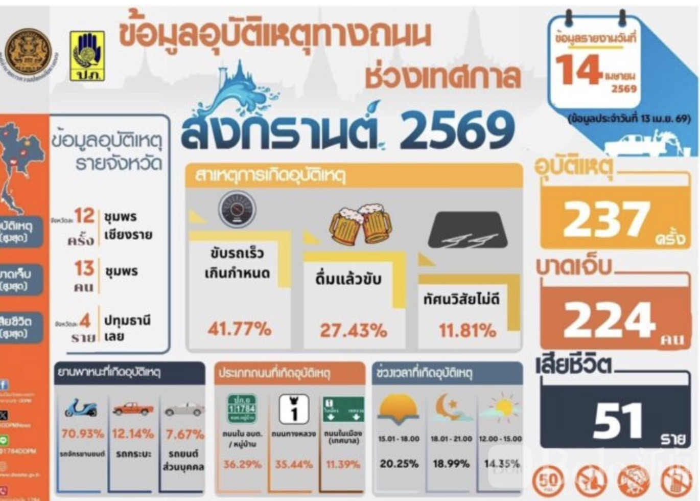 各地统计显示,4月13日事故发生最多的府为春蓬府和清莱府(各12起),受伤人数最多为春蓬府(13人),死亡人数最多为巴吞他尼府和黎府(各4人)。