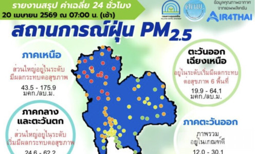 东北部有6个地区超标,检测值为19.9至64.1微克/立方米;中部及西部多数区域同样超过标准,数值在24.6至62.2微克/立方米之间。相比之下,东部、南部以及曼谷及周边地区空气质量整体仍处于良好水平。