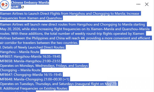 Bole新闻专讯:中国驻马尼拉大使馆于4月25日发布消息,厦门航空将于2026年5月起进一步加码中菲航线网络,新增杭州、重庆直飞马尼拉航线,并同步加密厦门及泉州往返航班。航线调整完成后,中菲之间每周往返航班总量将提升至44班,为两国旅客提供更多出行选择。