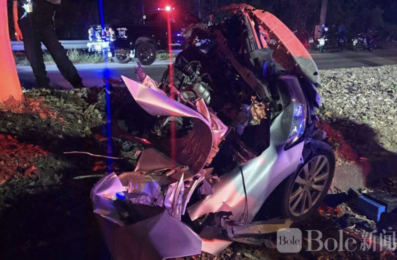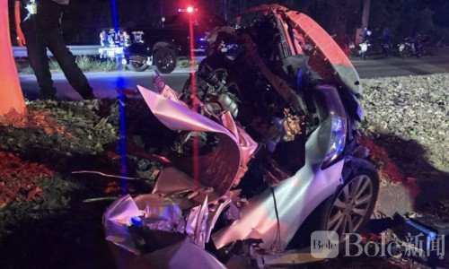 Bole新闻专讯:泰国呵叻府发生一起严重交通事故,一名24岁工程系四年级学生在凌晨驾车返回宿舍途中车辆失控,撞上路灯及中央隔离带,车辆严重损毁,送医后不治身亡。