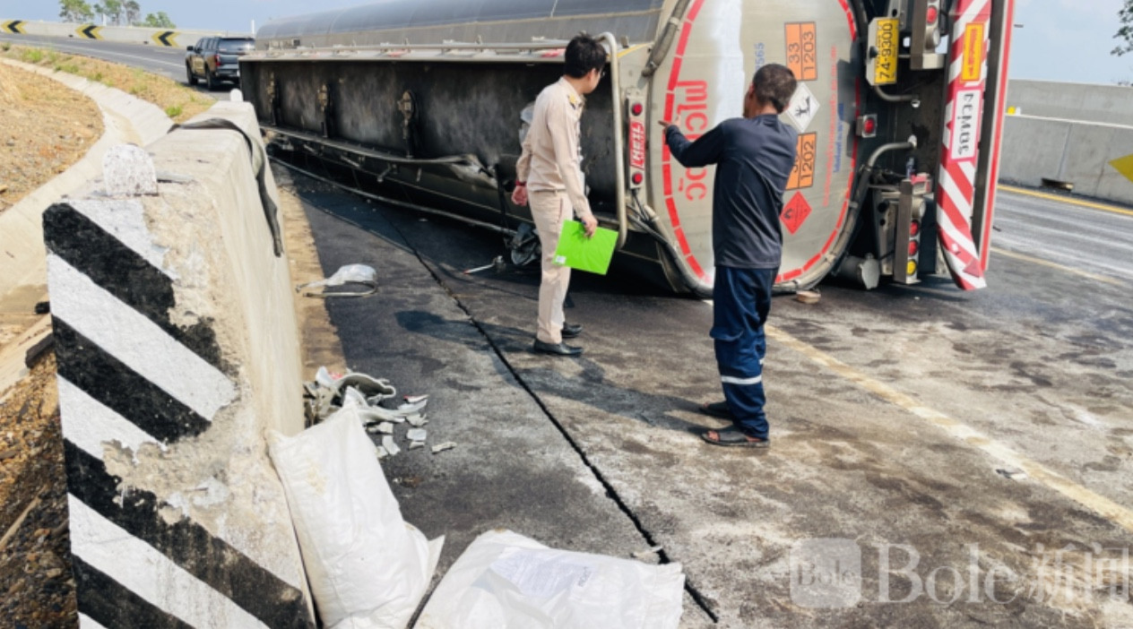 泰国油罐车侧翻:5000升燃油洒满路面,现场紧急封锁!