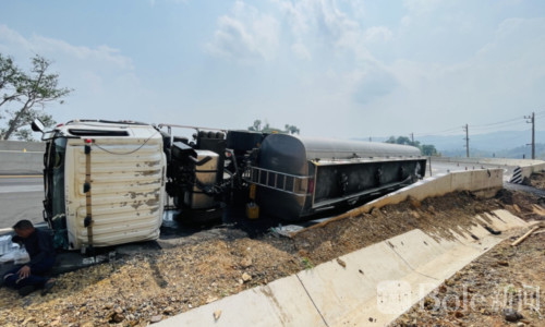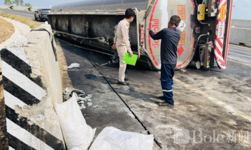 Bole新闻专讯:泰国楠府通昌县27日发生一起油罐车侧翻事故,一辆载有约4万升燃油的半挂油罐车在弯道路段失控翻覆,约5000升燃油泄漏并流到路面,一度引发紧张气氛。所幸当地多部门迅速赶到现场处置,目前情况已经基本稳定,道路交通也恢复正常。