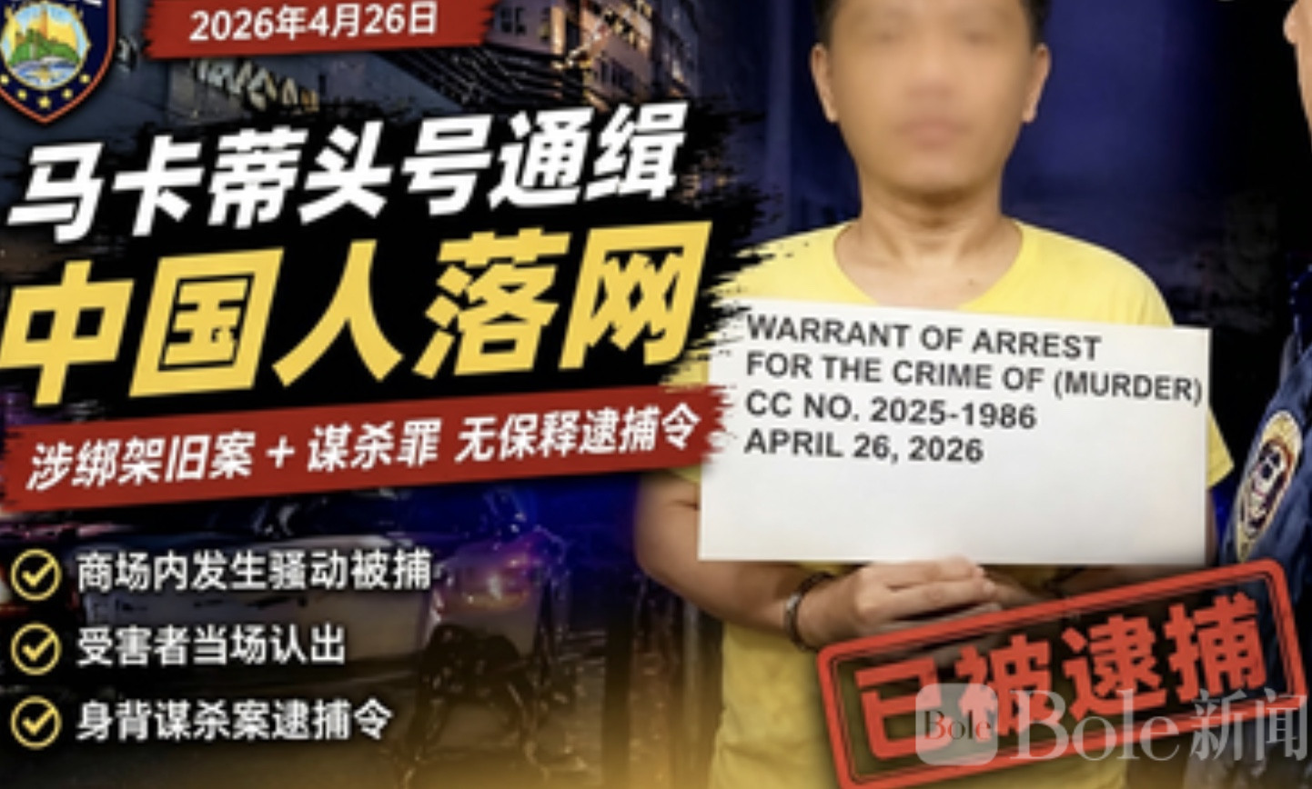 Bole新闻专讯: 4月26日下午,菲律宾马卡蒂市一处人流密集的热门商场内突然出现警察身影,一名中国籍男子在现场被警方带走。随着调查展开,这名看似普通的男子很快被确认身份——他正是马卡蒂警署列入“2026年5月十大通缉犯名单”的头号通缉对象,身背一起谋杀案件的逮捕令,而且案件性质严重,不允许保释。