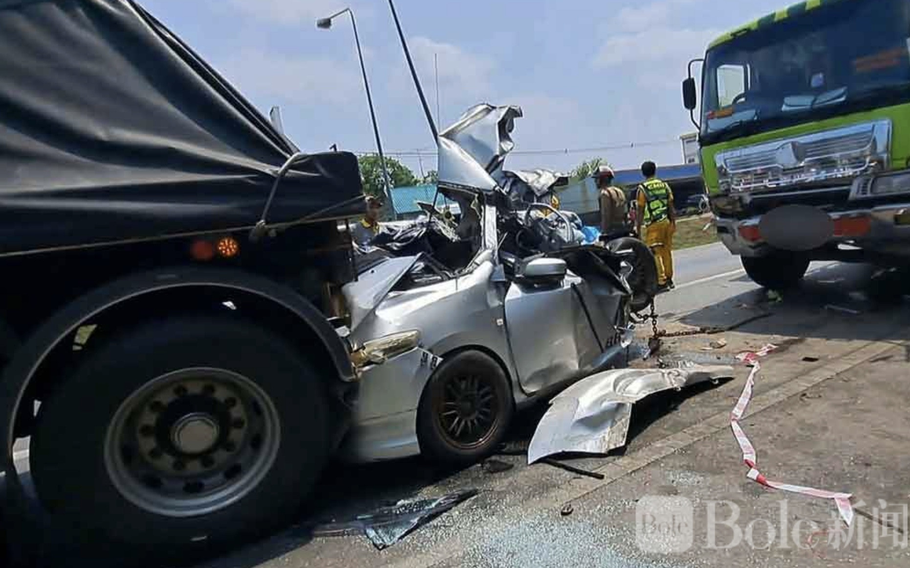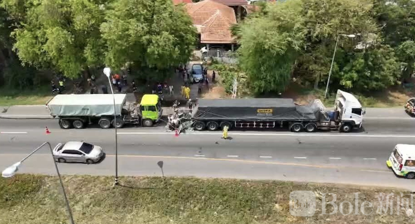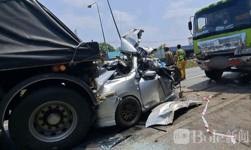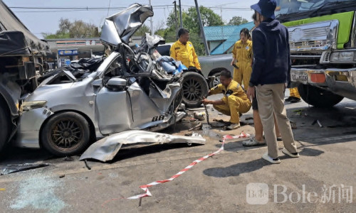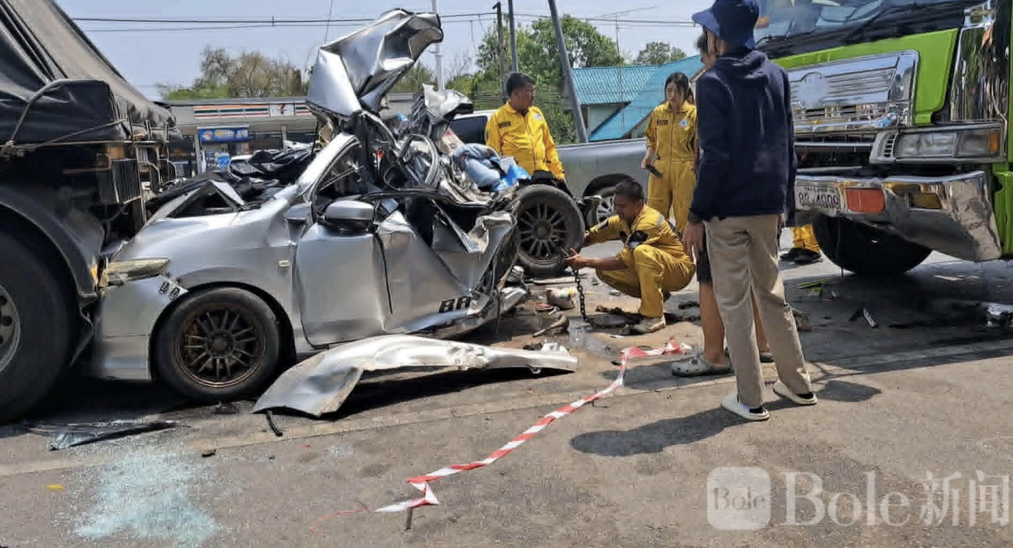Bole新闻专讯: 泰国玛哈沙拉堪府一处大型十字路口29日发生一起令人揪心的严重交通事故。一辆满载石料的重型卡车在路口未能及时刹车,猛烈撞上前方轿车,轿车被夹在两辆大型车辆之间几乎被压成废铁。事故造成一名9岁女童不幸身亡,车内另外两名女性——包括孩子的母亲——重伤送医。警方初步调查后认为,事故主要源于卡车司机的疏忽驾驶,目前正准备依法追究其责任。