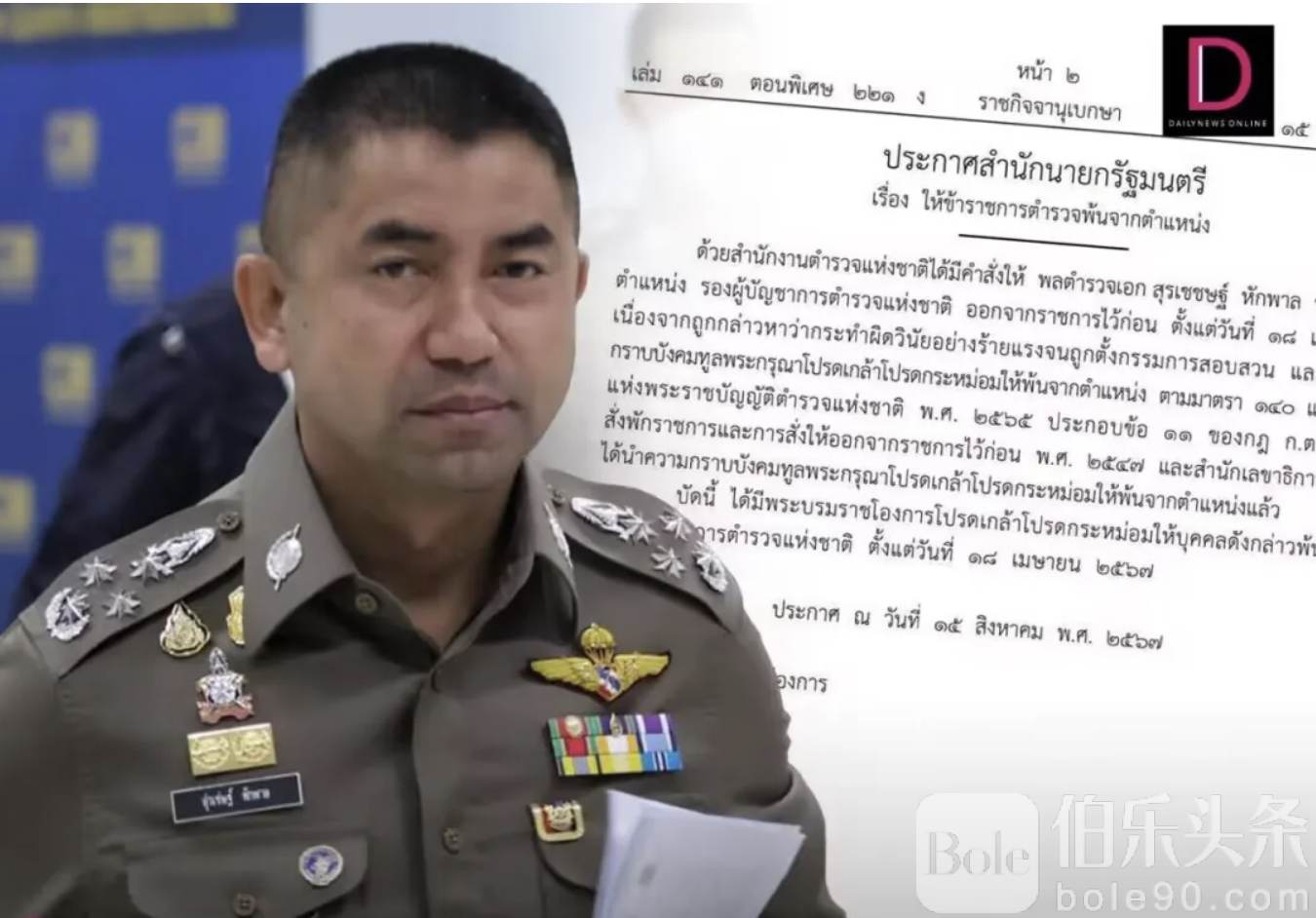 伯乐头条专讯:近日,泰国宪法法院裁定罢免赛塔总理职务成为近期泰国社会的备受关注的重要大事件。而8月15日,泰国政府公报网发布了一则解除政府警务公职人员的公告。