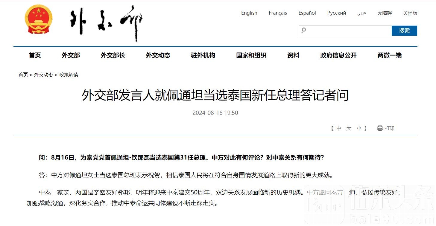 伯乐头条专讯:中国外交部发言人就佩通坦当选泰国新任总理。
