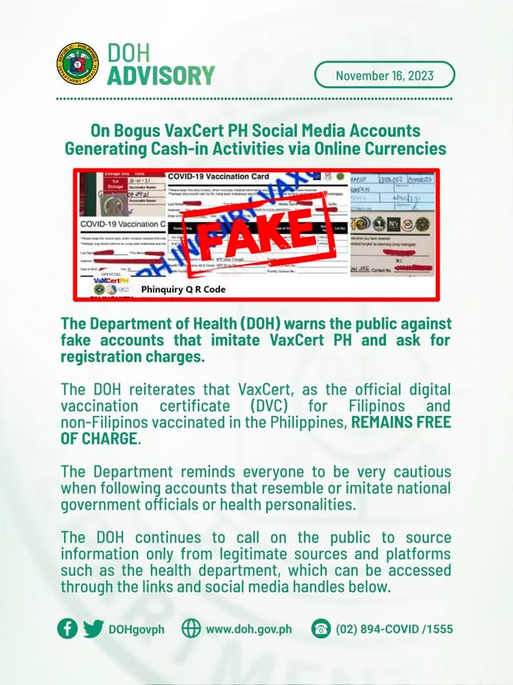 卫生部随后提醒菲律宾人在接触类似或冒充政府官员或卫生官员的账户时要小心谨慎。卫生部还建议公众仅从可信来源和该部门的官方社交平台获取信息。