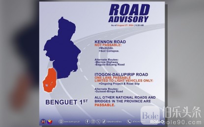 伯乐头条专讯:公共工程和公路部(DPWH)周二表示,本格特省和卡林加省的部分路段要么无法通行,要么交通受限。