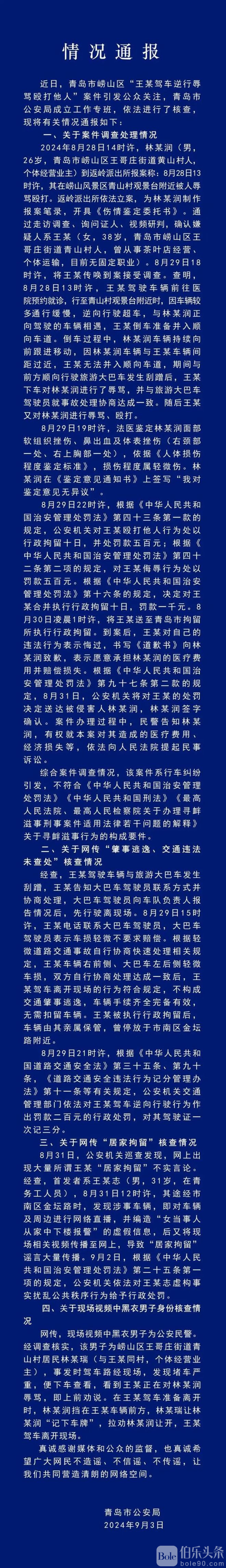 而今天的通报中也提到,王某对自己的违法行为表示悔过,书写《道歉书》向林某润致歉,表示愿意承担林某润的医疗费用并赔偿损失。
