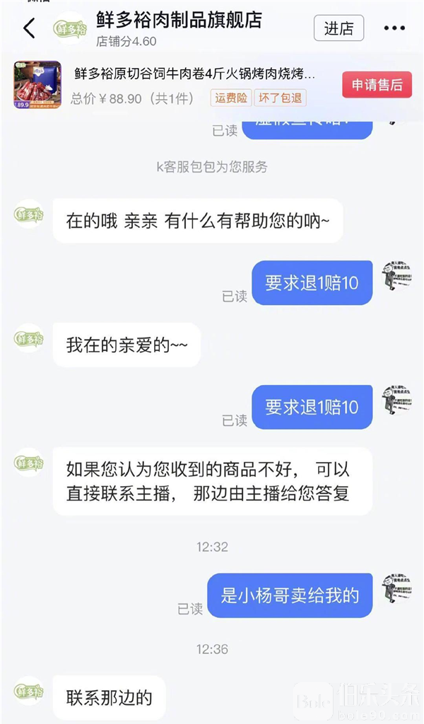 11月,小杨哥带货的“鲜多裕澳洲谷饲牛肉卷4斤”,在商品详情页面和直播中,均宣称产品为原切肉而非调理肉。但实际上,其产品疑似为合成拼接肉。最后鲜多裕公司被市场监督局罚款50万,责令整改。