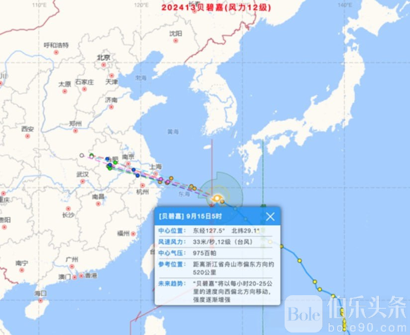 “贝碧嘉”正以每小时30至35公里的速度向西北方向移动,并且强度正在逐渐增强。预计台风将于15日夜间至16日上午在宁波到上海地区登陆,登陆强度有可能达到台风级或强台风级别。