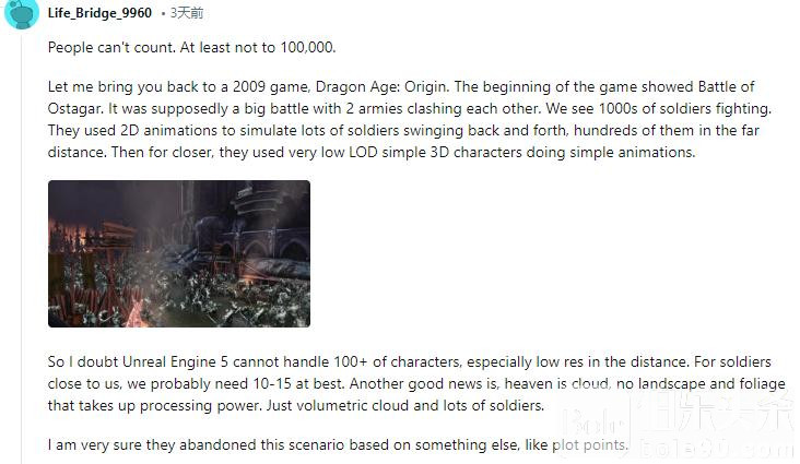 有网友展示了2009年《龙腾世纪:起源》开头的奥斯特加战役,认为可能是UE5还无法做到百人同屏