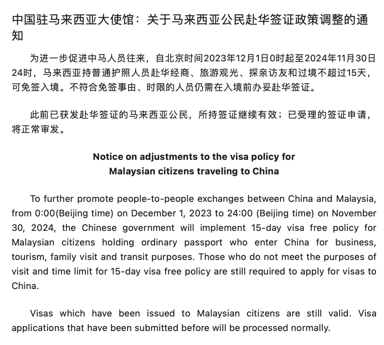 自2023年12月1日起,马来西亚对来自中国等国游客实施30天免签证入境措施。