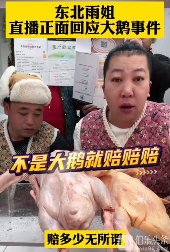 去年年底,有网友发现东北雨姐直播间售卖的“大鹅”有货不对板、虚假宣传之嫌。有些网友甚至称收到的“大鹅”里有很多冰块,疑似注水处理过。东北雨姐后来开直播提供了一张《检疫合格证》,并承诺假一赔三。但这件事情并没有就此结束,反而愈演愈烈,于是东北雨姐在今年1月前后短暂地停播了一段时间。