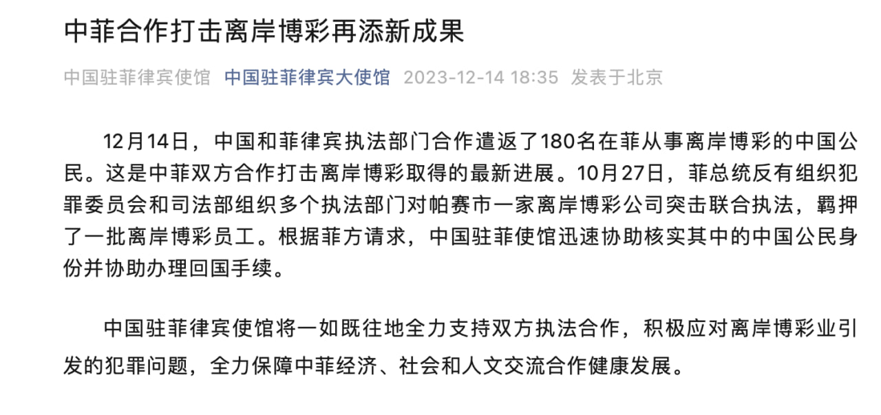 12月14日,中国和菲律宾执法部门合作遣返了180名在菲从事离岸博彩的中国公民。