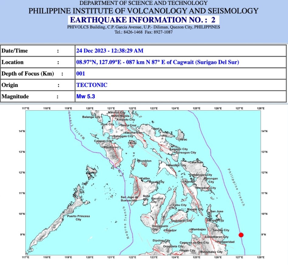 另外,12月24日午夜12点38分,菲律宾棉兰佬岛东部南苏里高省(Surigao del Sur) Cagwait镇东部外海发生5.3级地震,地震深度1公里。当局同样预计此次地震不会引发海啸或造成大规模伤亡及财产损失。