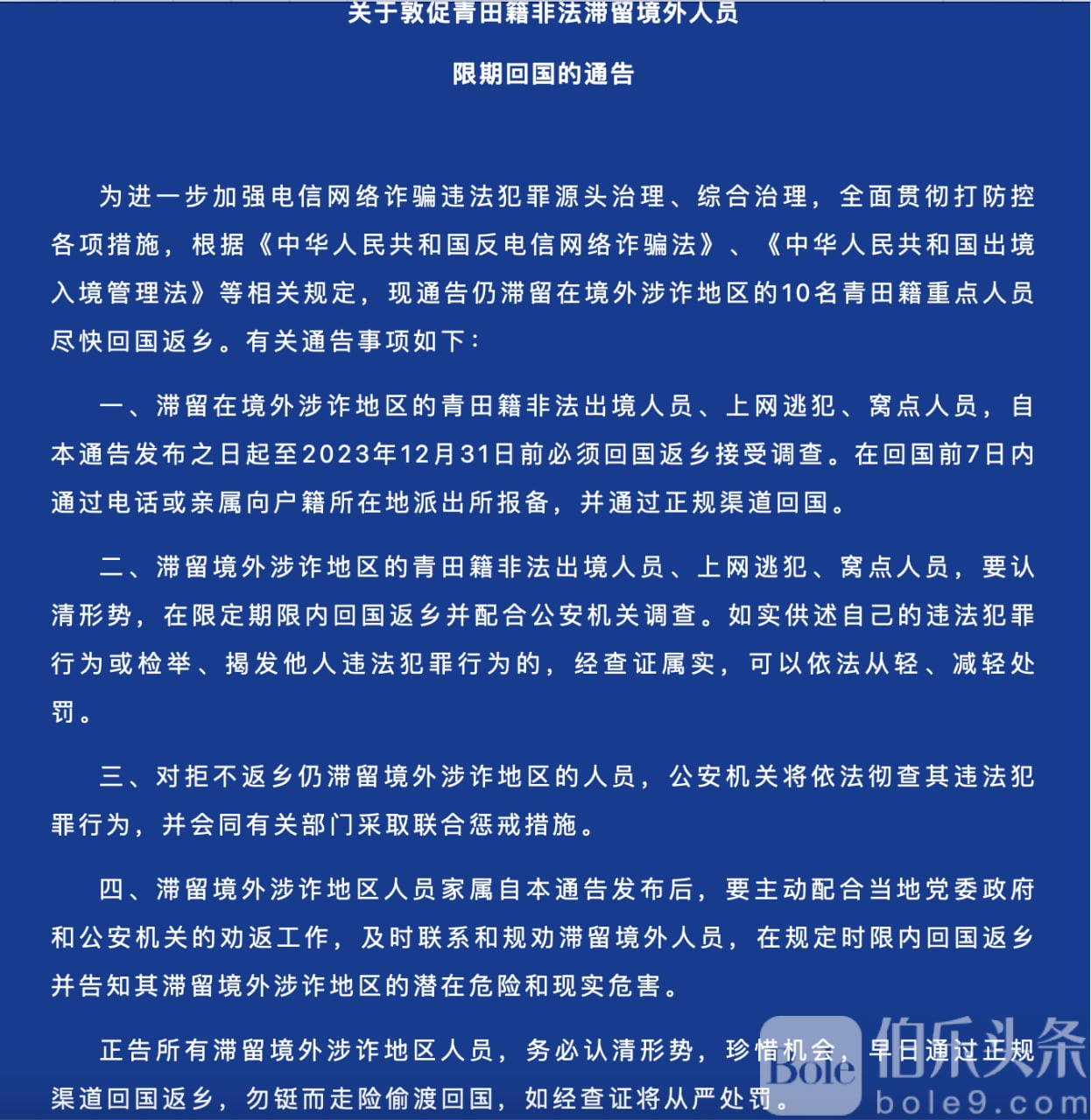 为进一步加强电信网络诈骗违法犯罪源头治理、综合治理,全面贯彻打防控各项措施,根据《中华人民共和国反电信网络诈骗法》、《中华人民共和国出境入境管理法》等相关规定,现通告仍滞留在境外涉诈地区的10名青田籍重点人员尽快回国返乡。有关通告事项如图