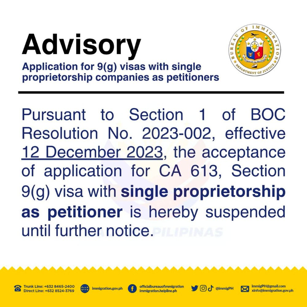 伯乐头条专讯:当地时间12月29日,菲律宾移民局(BI)发布公告,宣布暂停以独资公司为申请人申请9G工作签证的请求。