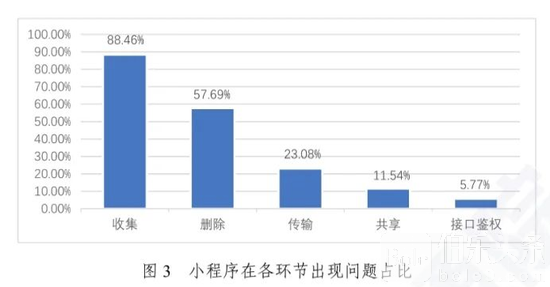 今年上半年,中国信息通信研究院选取了知名度高、影响范围广、涉及较多个人信息的52款小程序进行了个人信息保护安全评测。从测试的内容看,小程序涉及的个人信息安全风险问题较为普遍,其中教育文化、旅游交通、新闻资讯类小程序的问题最为突出,主要集中在数据收集、传输以及删除等环节。
