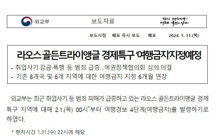 伯乐头条专讯:韩国已实施四级旅行警报,这是其四级咨询系统中最高的 禁止其国民前往臭名昭著的老挝“金三角”地区 自 2 月 1 日起生效