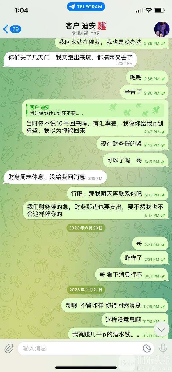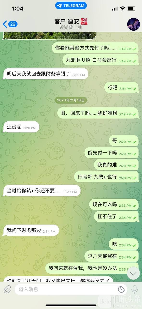 伯乐头条专讯:网友投稿!曝光这个人,他叫迪安,2023年5月在凤凰会KTV 签单我11w  从6月开始就开始跟我拖,刚开始还回复,现在完全不回复了,我就联系他的朋友,@ksbb001    @tianbao1234  说他盘口被端了 进去了