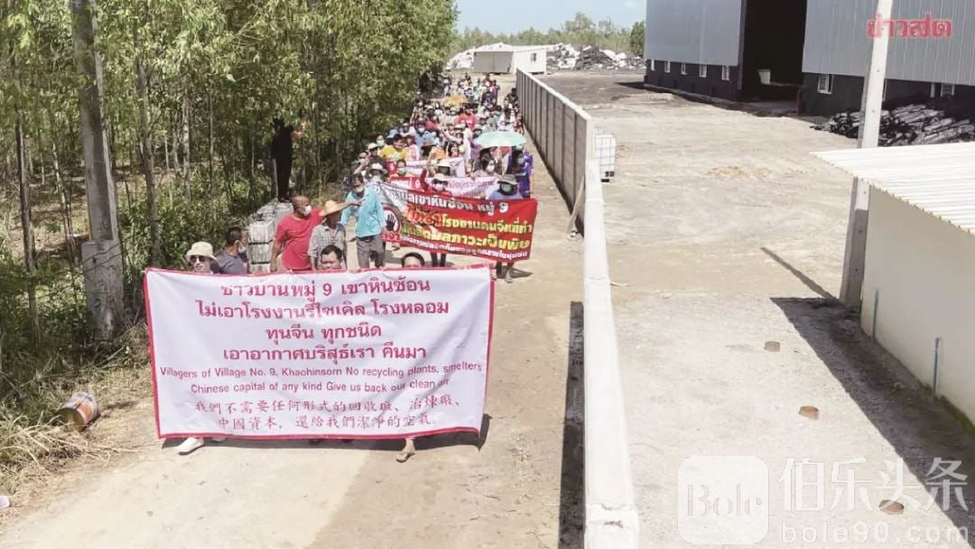 伯乐头条专讯:北柳府帕农沙拉堪县khan Hin Son区一社区领导和村民超过200人聚集在一起,举着抗议在当地建设有污染工厂的横幅游行,他们约定从村庄出发,一起来到正在修建的由外资投资的工厂,村民们手中持有中英泰三语横幅,上面写着khan Hin Son 9村不要回收厂、冶炼厂和所有中国资本,请把清新的空气还给我们。