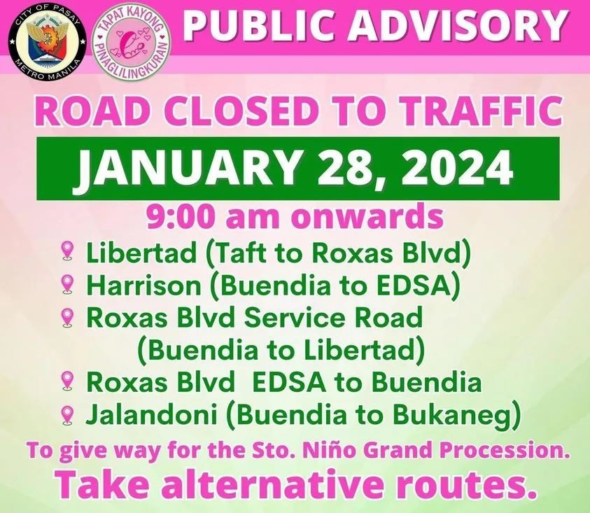 伯乐头条专讯:菲律宾帕赛市政府宣布,1月28日,该市部分地区的道路将被关闭,以便为圣婴盛大游行让路。