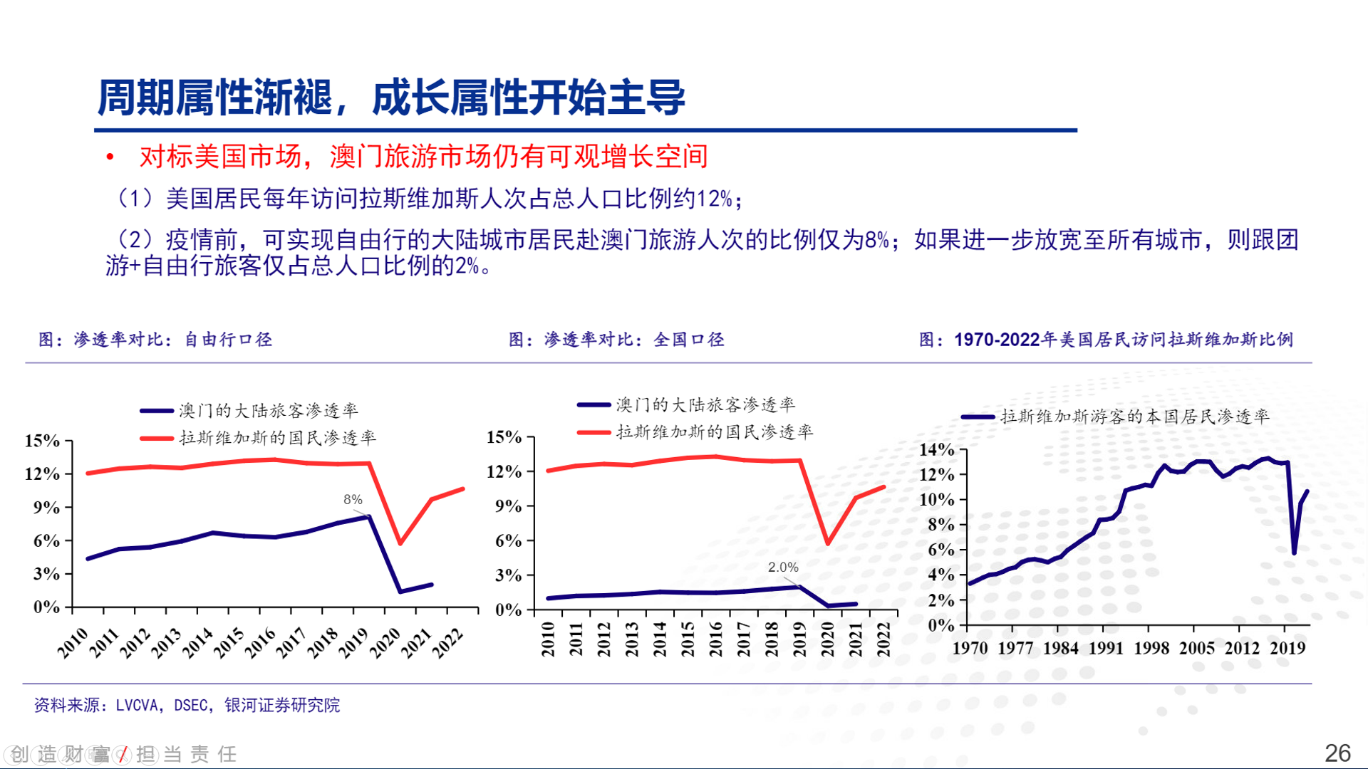 (2)资金监管、行业法规日趋完善,有助于澳门博彩业可持续发展。自2012年内地反腐运营持续推进,以及入境澳门的签证政策、金融监管政策趋严,自2014年以来贵宾厅博彩收入在澳门博彩行业占比持续下降。此外,伴随2022年新的博彩法正式实施,监管较为薄弱的中介人行业基本宣告结束,未来澳门将全面转向以博彩为特色元素的MICE市场,额外的政策风险可见度已大幅降低。