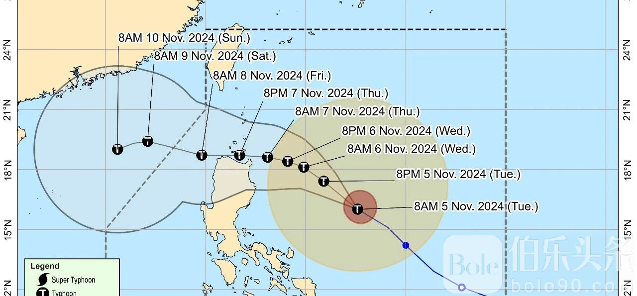 伯乐头条专讯:菲律宾气象局通报,强热带风暴“银杏”已在11月5日(周二)上午8点增强为台风。最新报告指出,“银杏”中心附近的最大持续风速为每小时120公里,阵风高达每小时150公里。