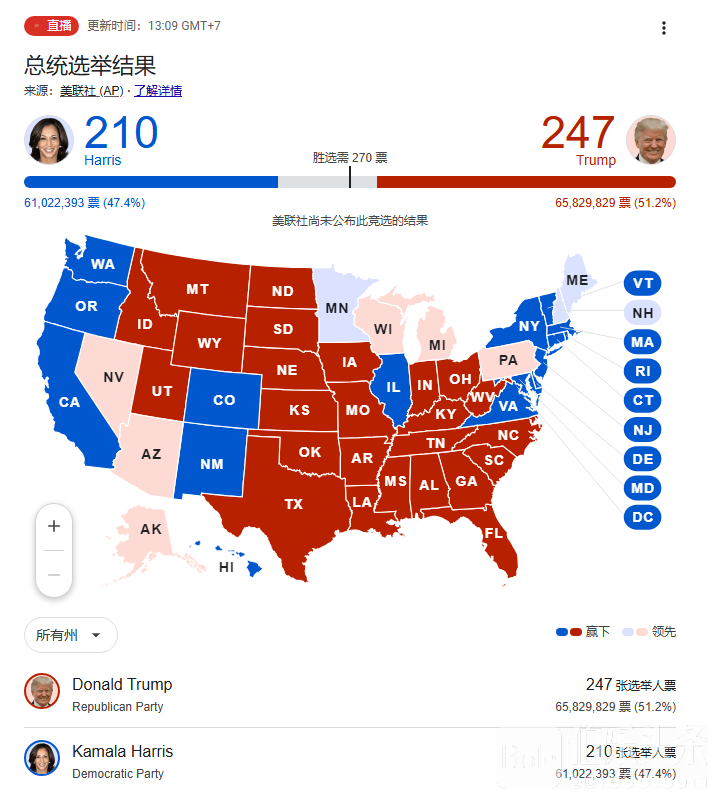 目前,美国总统大选计票正在进行中。根据多家美媒最新公布的初步测算,特朗普赢得“摇摆州”北卡罗来纳州的16张选举人票,预计特朗普目前获得247张选举人票,哈里斯得票数暂为210张。