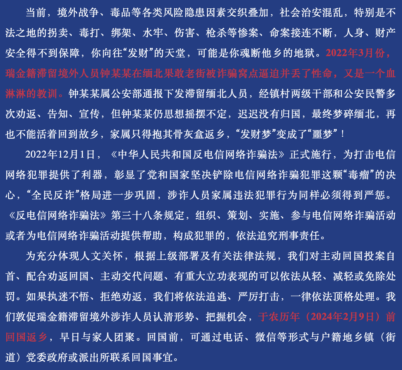 瑞金市公安局致瑞金籍滞留缅北人员及家属的一封信