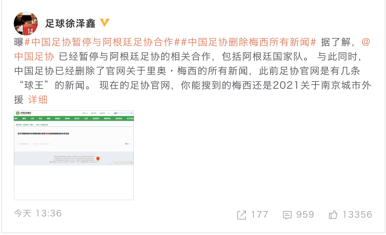2月8日,中国足协已经暂停与阿根廷足协的相关合作,包括阿根廷国家队。搜索发现,中国足协已经删除了官网关于里奥·梅西的所有新闻。