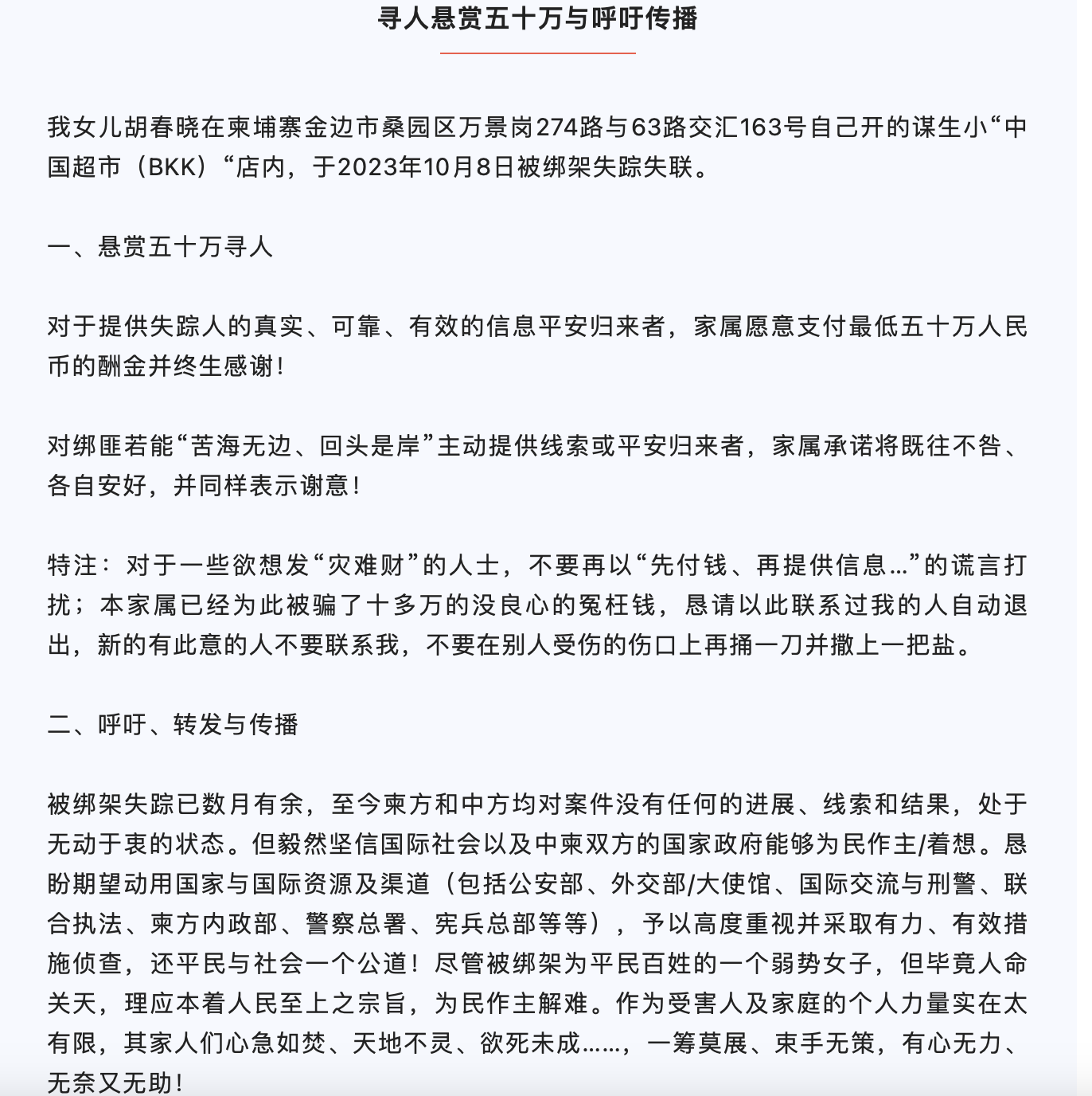 伯乐头条专讯:在金边万景岗(BKK)开超市的胡春晓2023年10月8日在自家超市内被绑架失踪失联,至今未有消息。胡春晓的父亲胡新华在社交媒体发布消息,悬赏50万寻人。