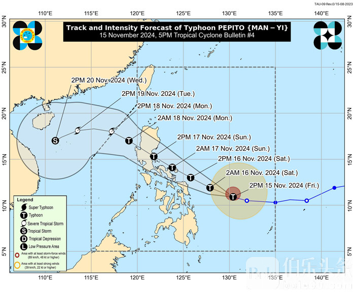 伯乐头条专讯:据菲律宾气象局PAGASA最新公告,台风“佩皮托”预计将在今天(星期六)迅速增强,并可能在今晚或周日凌晨登陆前达到超强台风级别。同时,强热带风暴“奥弗尔”已减弱并离开菲律宾责任区(PAR),但可能重新进入,并在吕宋岛北部带来影响。