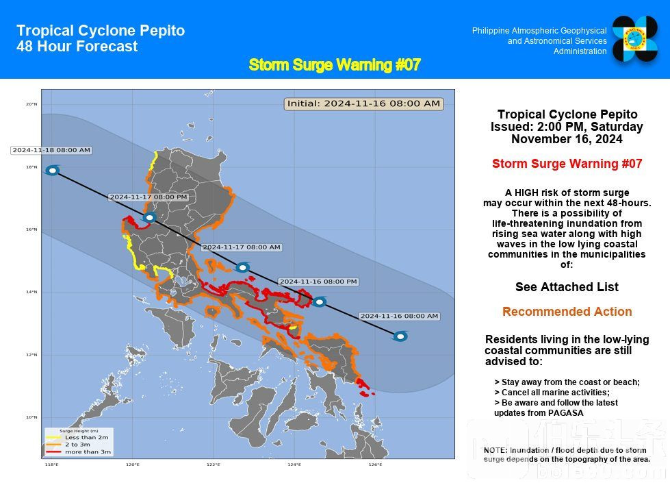 菲律宾大气与大气管理局在 11 月 16 日星期六下午 2 点发布的公告中表示:“海平面上升以及一些城市的低洼沿海社区可能出现巨浪,造成危及生命的洪水泛滥。”