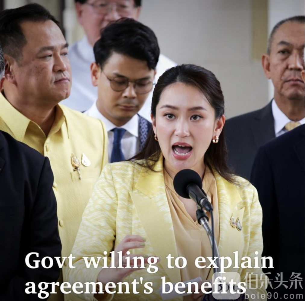 伯乐头条专讯:泰国总理巴东丹·西那瓦坚称,政府已准备好解释其决定支持泰国与柬埔寨就两国在泰国湾重叠的海事主张签署谅解备忘录 (MoU)。