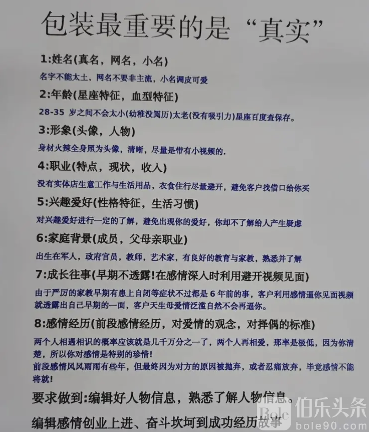 这些话术本详细记录了诈骗分子的每一个步骤,仿佛是一本本指导手册,一步步精心策划,引诱受害者落入他们的圈套。想骗钱先伪装,诈骗分子通常会精心包装自己,塑造出一个令人信任的人设,作为行骗的起点。一旦诈骗分子锁定目标下一步就是聊天,通过他们的“甜言蜜语”,一步步聊出“爱情的火花”。