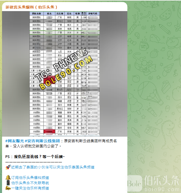 伯乐头条专讯:今日,一名不知名网友在伯乐头条频道投稿,内容一经发布便引发了广泛关注和讨论。投稿中,该网友曝光了菲律宾天使城云线集团(某杀猪盘集团)的所有员工名单,并附上了详细的成员信息。图片显示的内容引发了不少猜测,虽然没有明确的联系方式,部分网友推测这可能是一种威胁性质的声明,且内容似乎暗示着后续可能会有更进一步的动作。