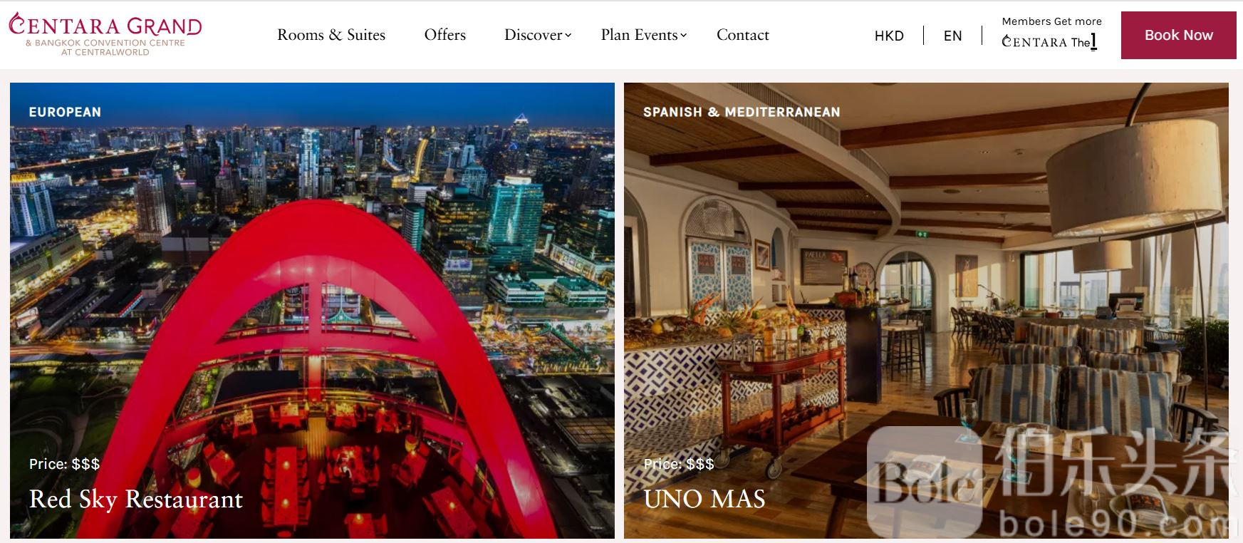 1.Red Sky:这家餐厅位于 Centara Grand 酒店内,只提供晚餐晚餐:每日17:00 - 01:00。提供法式和欧洲风味美食,招牌菜Surf&Turf Tower,Thermidor,Klong Phai Chicken,可预定位置。