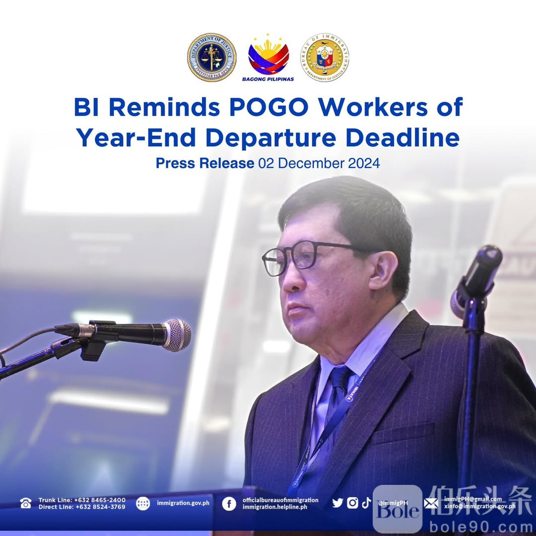 伯乐头条专讯:菲律宾马尼拉移民局 (BI) 已向菲律宾离岸博彩运营商 (POGO) 雇用的外国工人发出提醒,要求他们在政府规定的年底前离开该国。