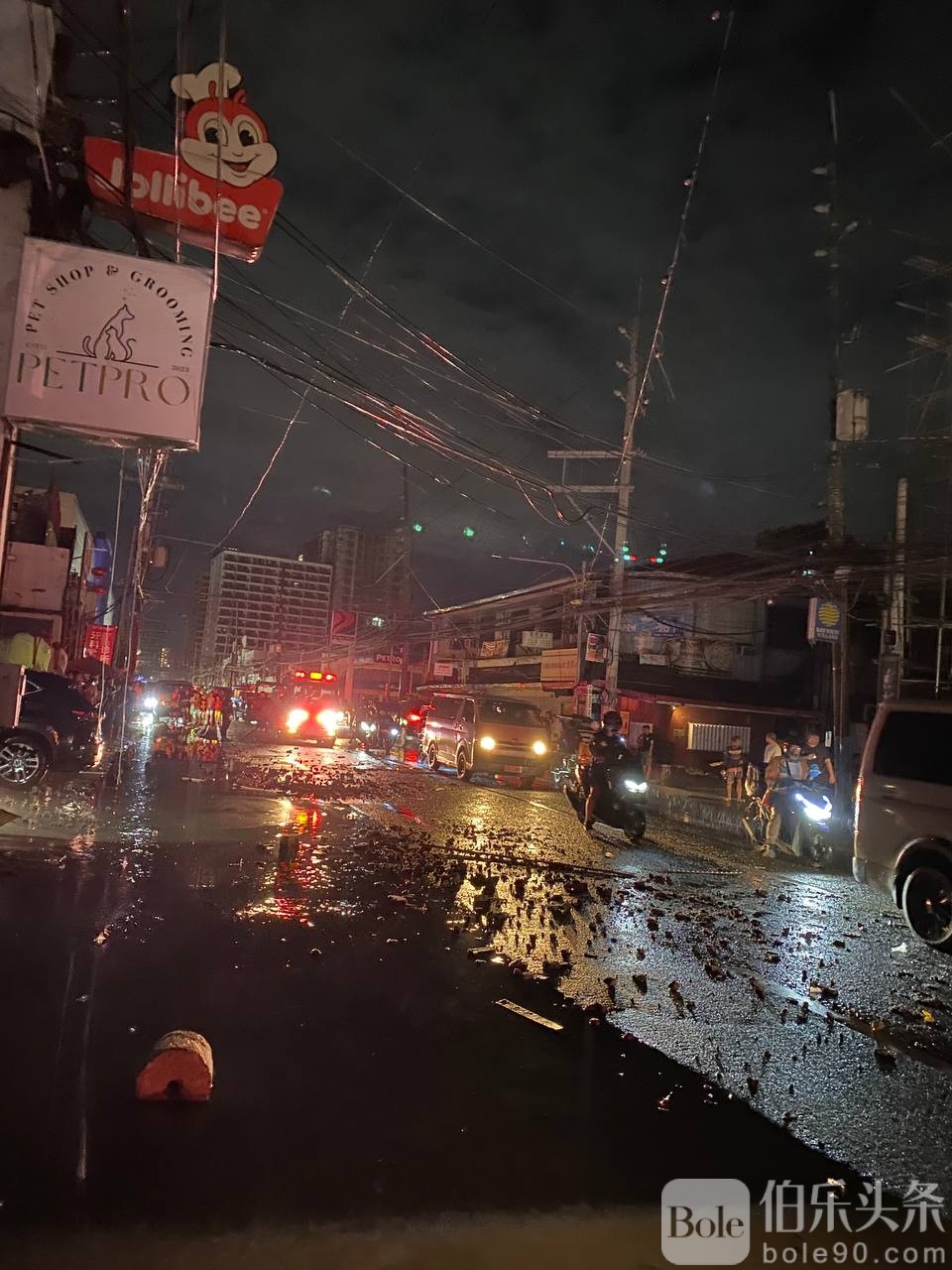 伯乐头条专讯:当地时间3月9日星期六晚上,菲律宾巴兰玉计市(Paranaque)Quirino大道上,华庭附近一栋新修建筑的外墙水泥大块坠落,导致该大楼前道路上多条电线、车辆被毁坏,并造成多人受伤,现场乱成一片。