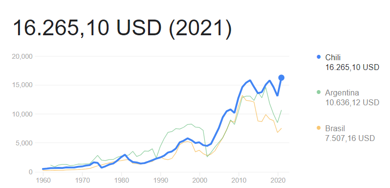 智利,南美洲最富裕的国家,以其多样化的经济结构和丰富的资源而著称。经历了几十年的发展,智利成为南美洲地区较为发达的经济体之一。从经济总量来说,智利并不算高。在2019年疫情期间经济下滑,在2021年又快速的回到疫情前的经济水平:比阿根廷底,但比秘鲁高。在人均收入上,智利超了阿根廷和巴西几条街,是巴西的2倍多,是阿根廷的1.5倍。和中国的人均经济相比,智利的人均经济是中国的1.3倍以上,几乎达到了中等发达国家的水平。