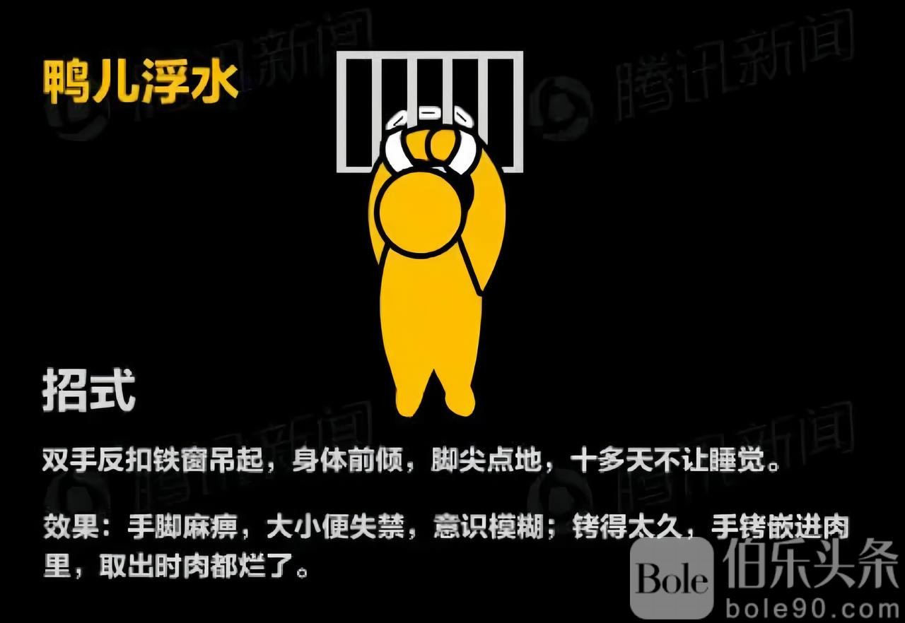 双手反扣铁窗吊起,身体前倾,脚尖点地,十多天不让睡觉。这使得被讯者手脚麻痹,意识模糊。